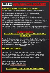 Misschien heeft u het al ergens anders gehoord of gelezen, maar de Werkgroep Hulptransporten Oost-Europa (WHOE) moet op zoek naar een andere opslagruimte. De loodsen H en I op het Zwitsalterrein moeten we leeg maken om zo ruimte maken voor woningbouw. Daarnaast wil de eigenaar van het terrein geen grote vrachtwagens meer op het terrein.